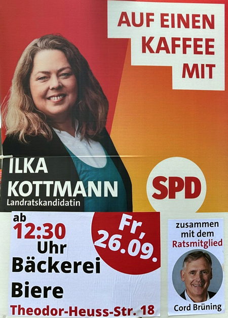 Wer die Landratskandidatin Ilka Kottmann persönlich kennenlernen möchte, hat dazu am Freitag, 26. September, die Gelegenheit. „Auf einen Kaffee“ lädt die SPD in die Bäckerei Biere in Hiddesen ein. Los geht es um 12.30 Uhr. Mit dabei ist das frisch gebackene Ratsmitglied Cord Brüning, der in Hiddesen das Direktmandat gewonnen hat.