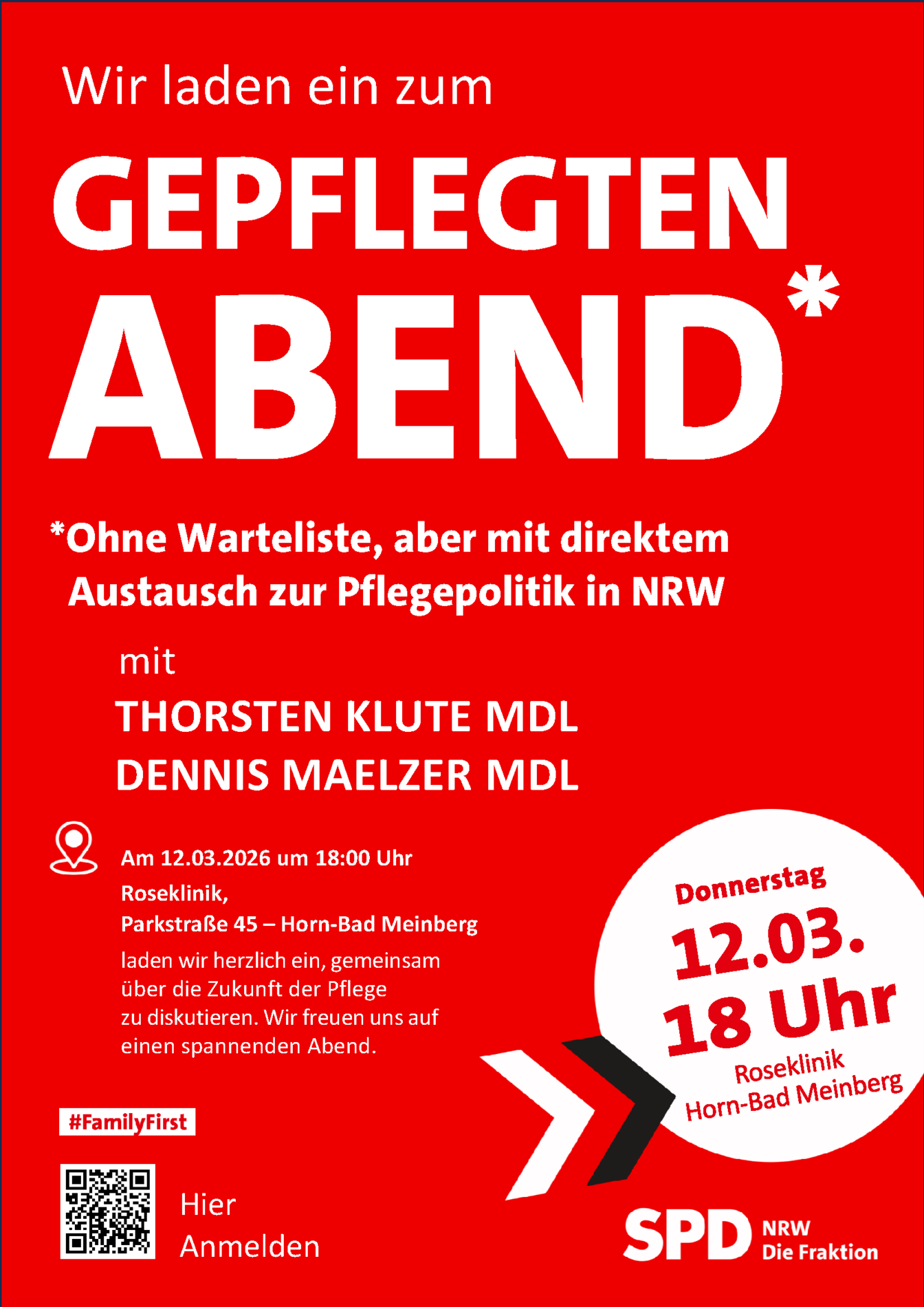 Ob Angehörige, Beschäftigte oder Bedürftige: Pflege betrifft viele Menschen. Über die aktuellen Herausforderungen und Perspektiven der Pflegepolitik in Nordrhein-Westfalen diskutiert der lippische Landtagsabgeordnete Dr. Dennis Maelzer (SPD) am Donnerstag, den 12. März, bei einer öffentlichen Podiumsdiskussion in Bad Meinberg. Unter dem Titel „Gepflegter Abend: Ohne Warteliste aber mit direktem Austausch zur Pflegepolitik in NRW“ lädt Maelzer um 18 Uhr in die Rose Klinik, Parkstraße 45–47, ein.